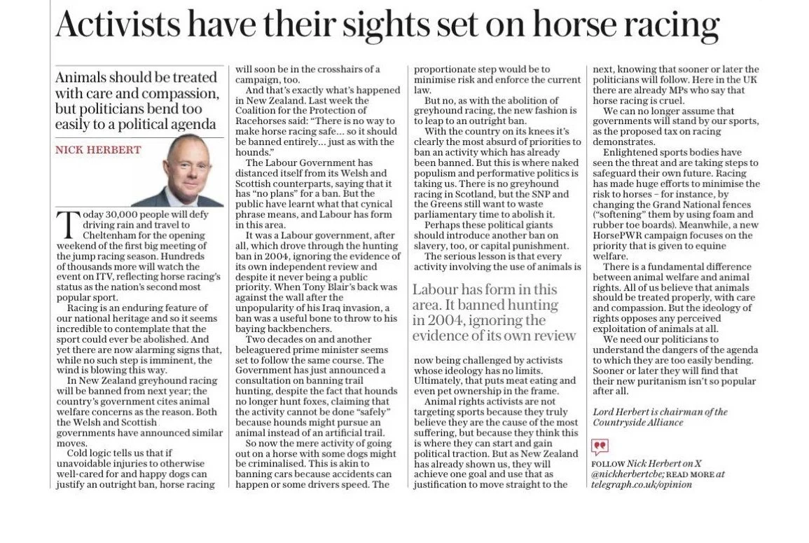 Animal rights activists aren’t targeting sports because they truly believe they are the cause of the most suffering, but because they think this is where they can start and gain political traction. But as New Zealand has already shown us, they will achieve one goal and use that as justification to move straight to the next, knowing that sooner or later the politicians will follow. Here in the UK there are already MPs who say that horse racing is cruel.